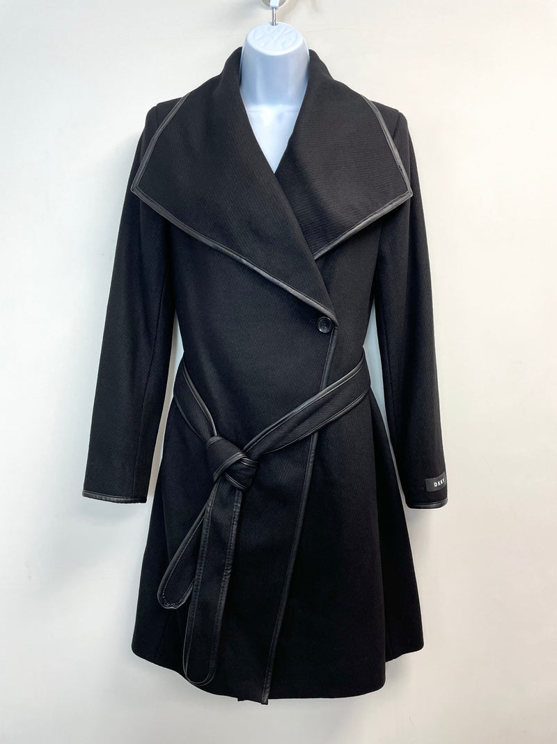DKNY Women's Wool Blend Leather Trim Wrap Coat in Black - Size XS