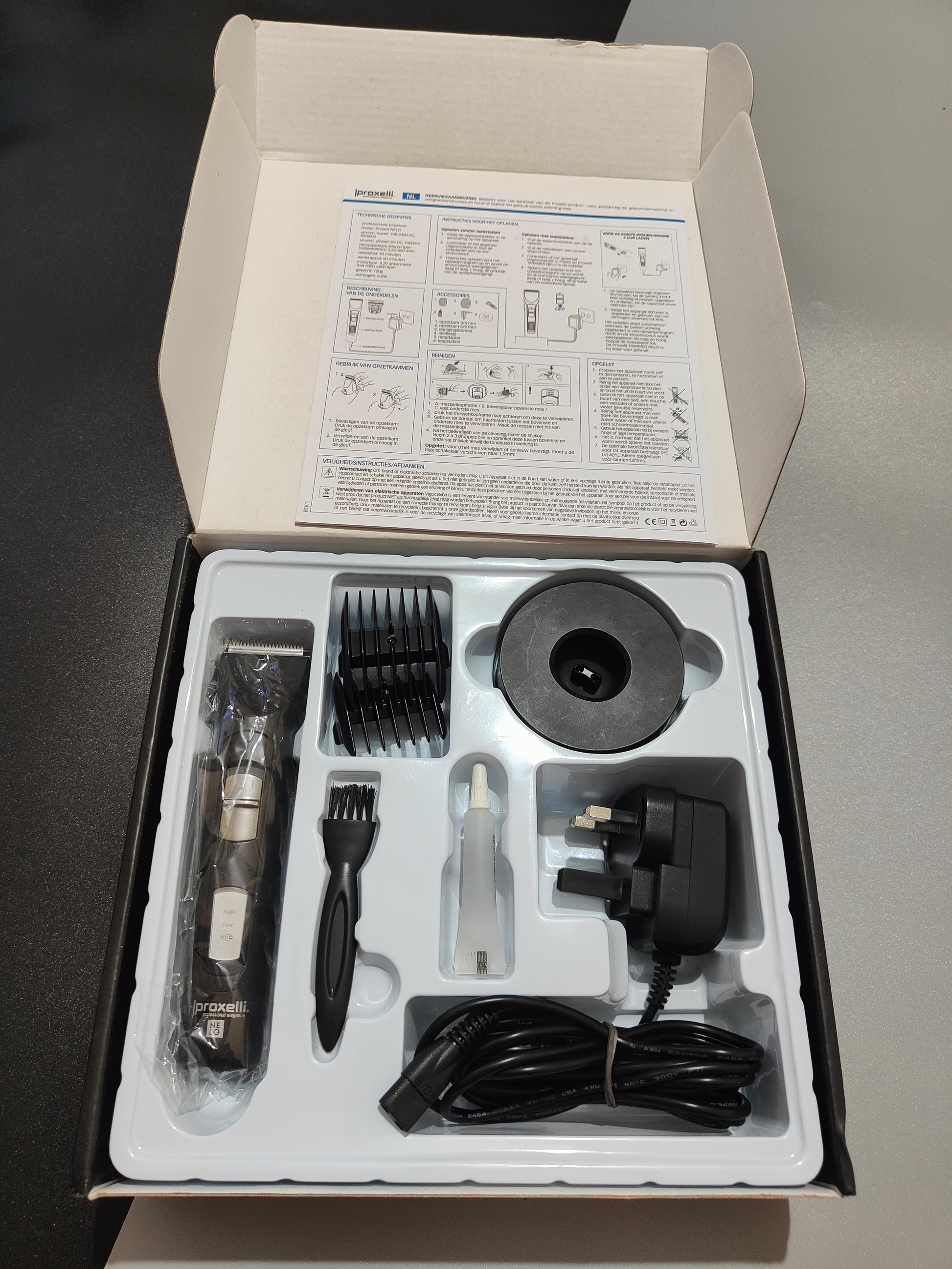 Proxelli Professional trimmer for battery use or use with cord. Detachable blade head in stainless steel. Includes adjustable comb attachments (3, 4, 5 & 6mm). With LED display which indicates the battery charging status. Trimmer with adapter, charger, 2 attachment combs, cleaning brush & oil bottle. For battery use or use with cord, with a rechargeable Lithium Iron Phosphate battery: 3,2V, 1000mA. Charging time: 90 minutes. Operating time: 90 minutes. Current: input: 100-240V AC, 50/60Hz. Motor type: 3.2V Pivot motor with 5000 400 RPM. Weight: 100g.