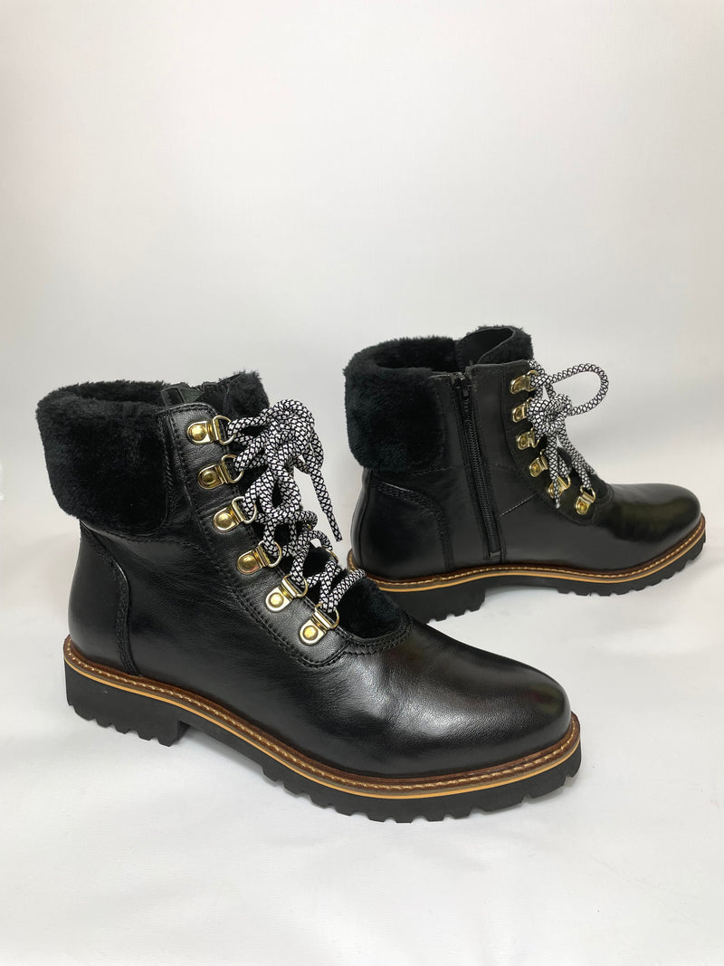 Perfect for chillier days is the Ravel Pinar ankle boot.  Crafted from premium leather, this women’s black ankle boot takes inspiration from the hiking boot trend yet it has a city ready vibe.  Key features of this women’s lace-up boot include D-ring lacing, hiker laces, a cleated sole unit and sumptuous faux fur trim and collar.