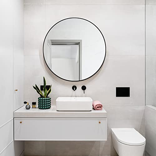 SATIN LAKE STAINLESS STEEL BEVELED ACCENT MIRROR CIRCLE SHAPE FRAMED MODERN FOR FHALLWAY, BEDROOM, BATHROOM WALL MIRROR, Black, 91.4x91.4CM STAINLESS STEEL FRAME.