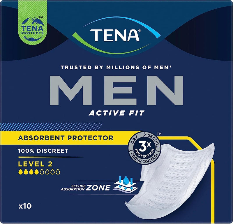 TENA Men Level 2 Absorbent Protector Incontinence Pads, 60 Incontinence Pads (6 x 10 Packs) for Men of All Ages, Cup-Shaped for Medium Bladder Weakness, Urine Leakage and Drips.