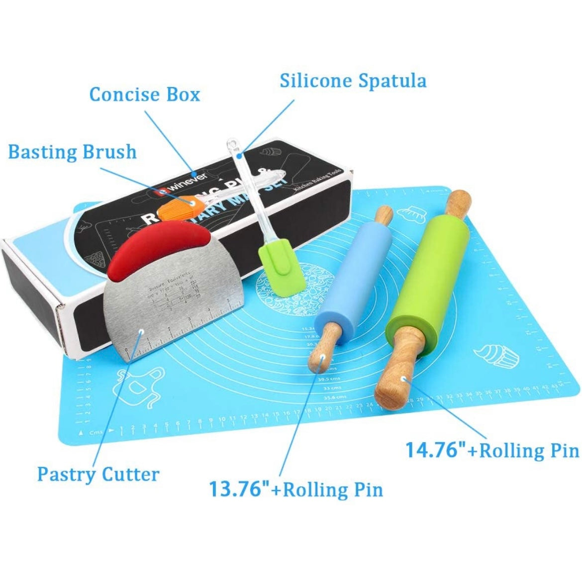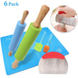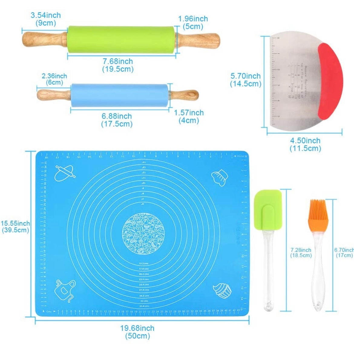 Colourful Rolling Pin Pastry Mat Set Non-Stick 6 in 1 Dough Roller Baking Kit with Pastry Cutter Reusable Knead Mat Scraper Basting Brush
