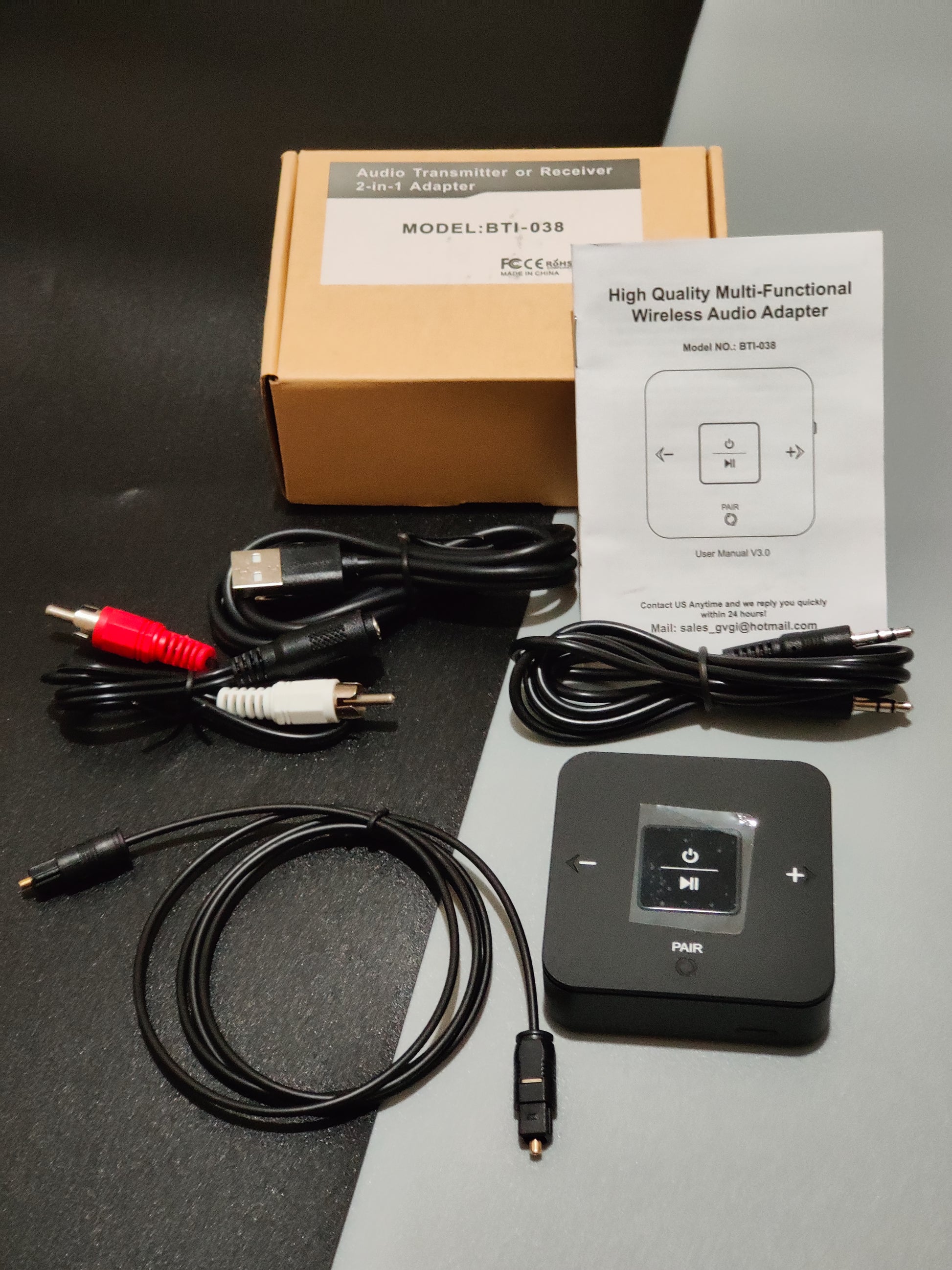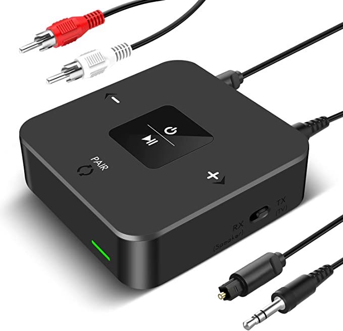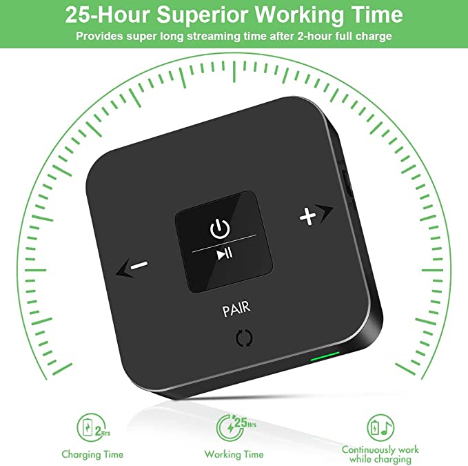 | Special features | Bluetooth Transmitter Receiver 2-in-1, with volume control, built in battery, 25 Hrs playtime, supports Optical AUX and RCA audio output, aptX Low Latency, works with TV PC wired speaker, home stereo |