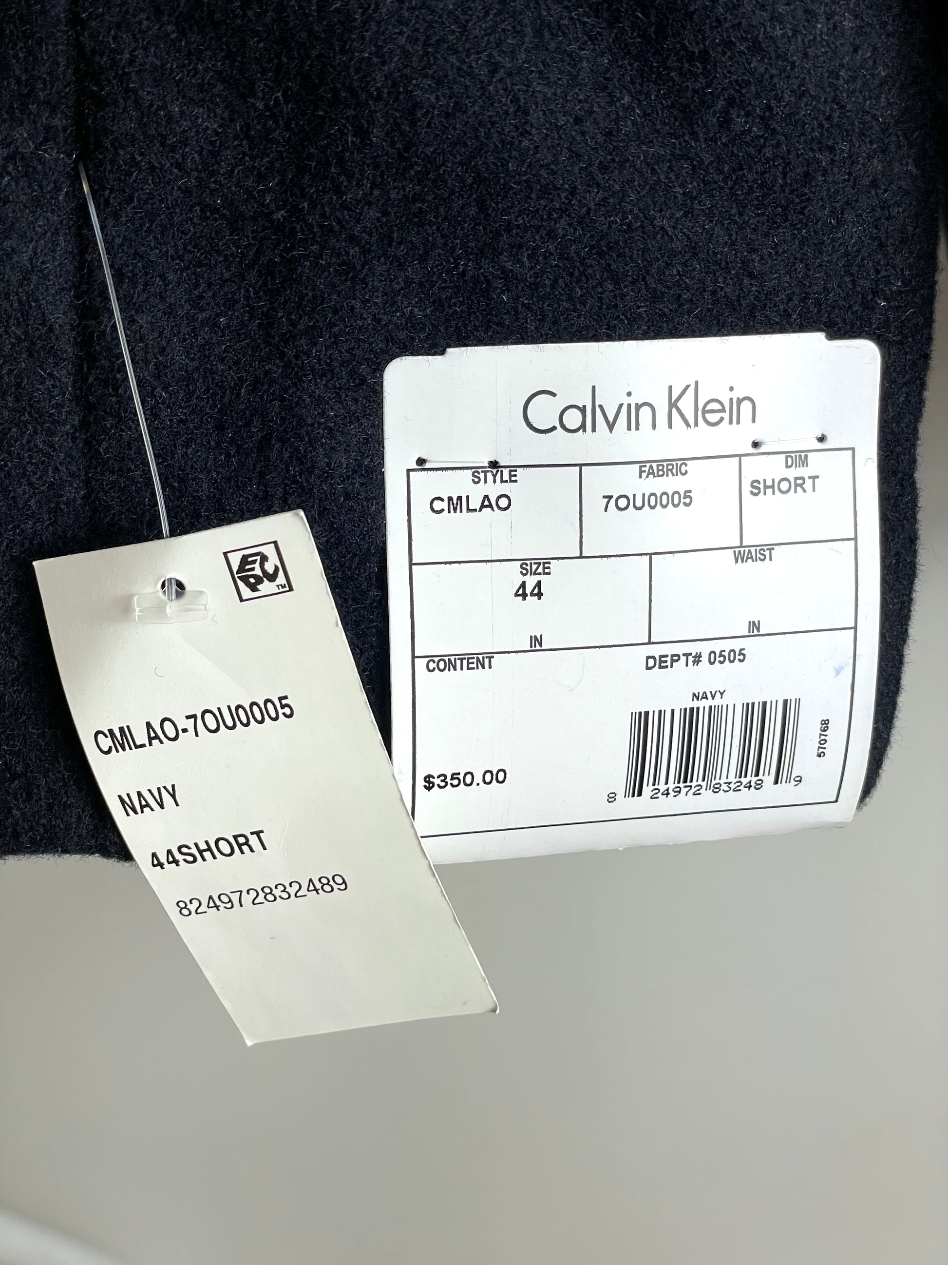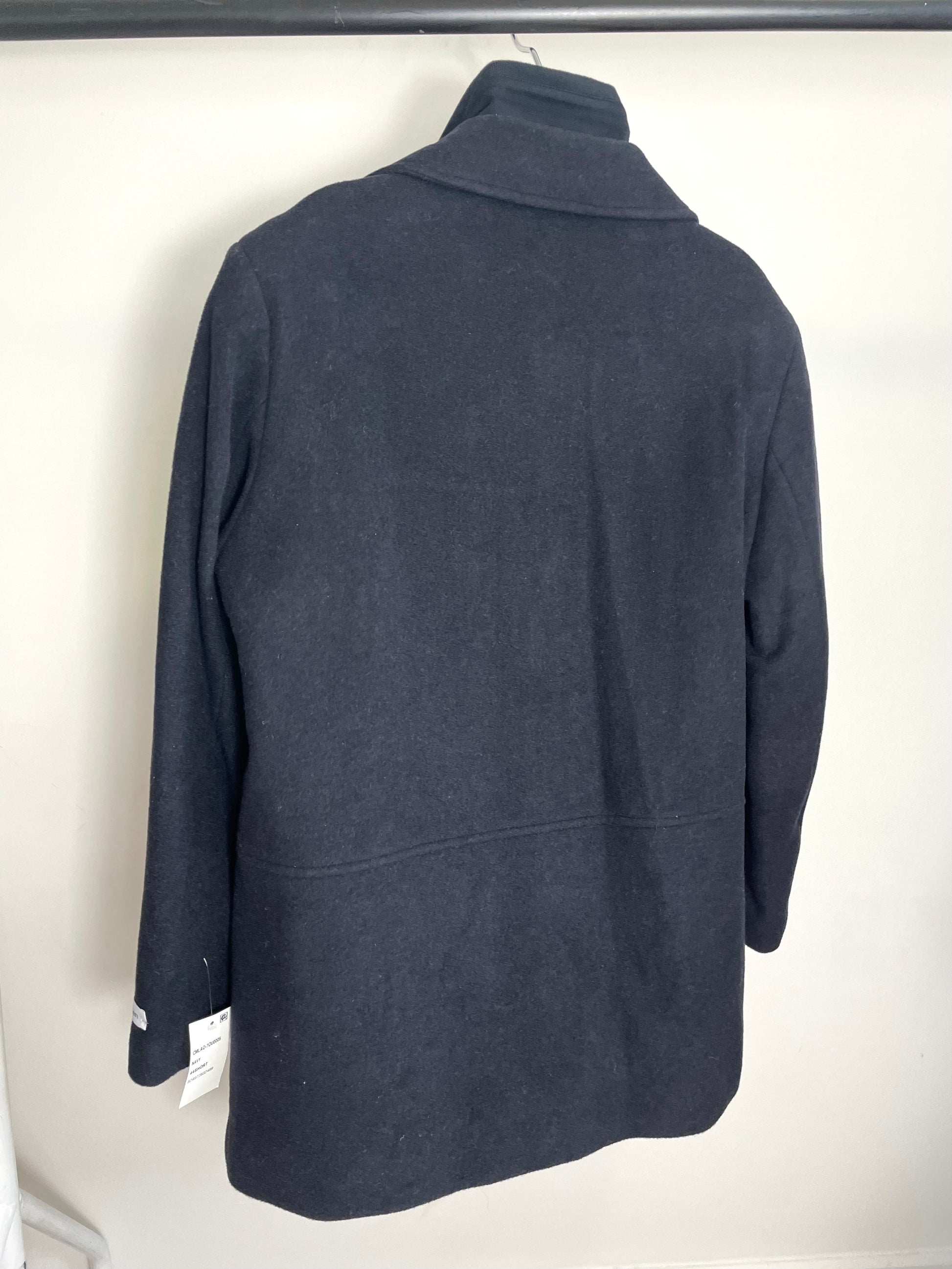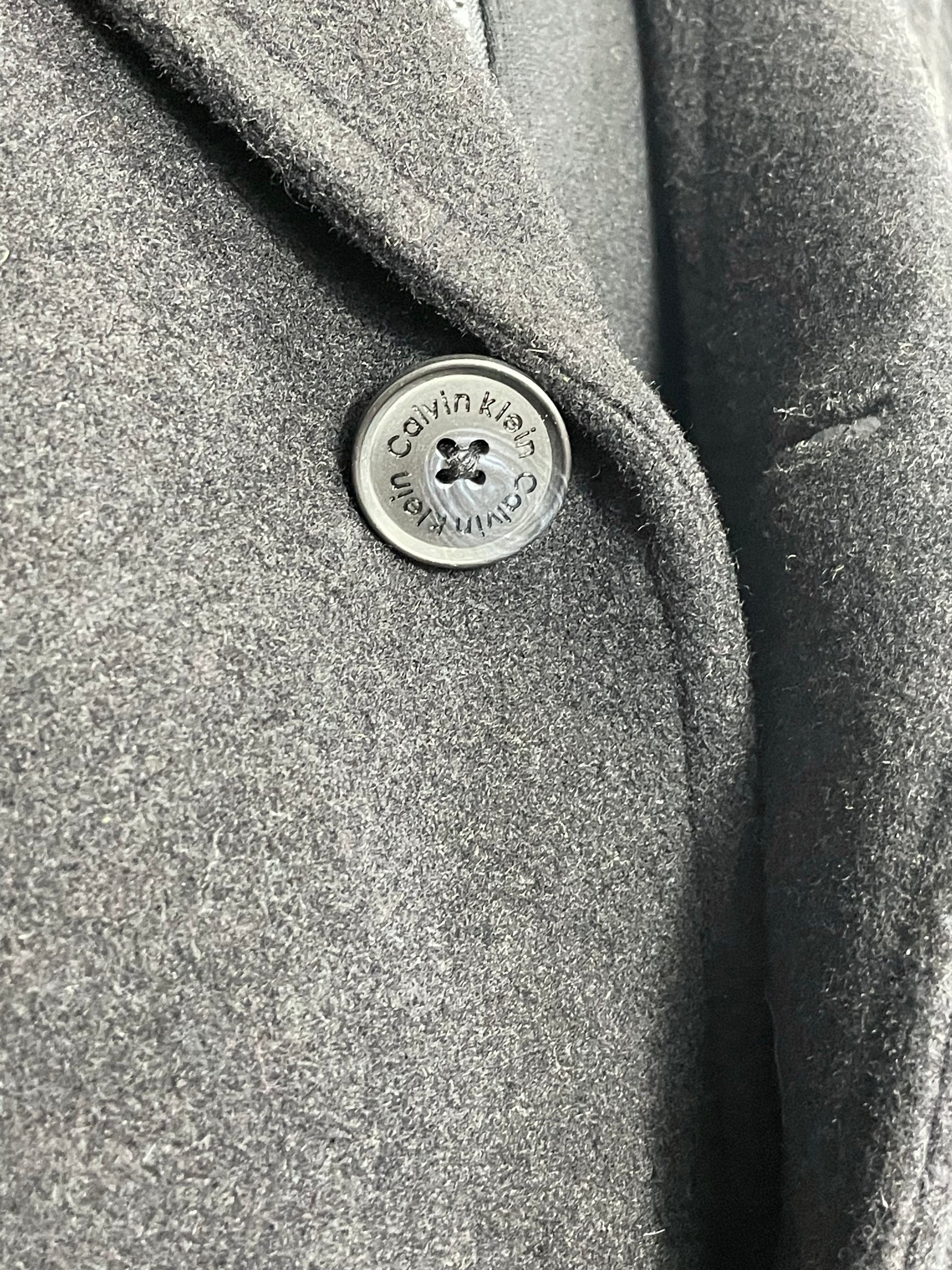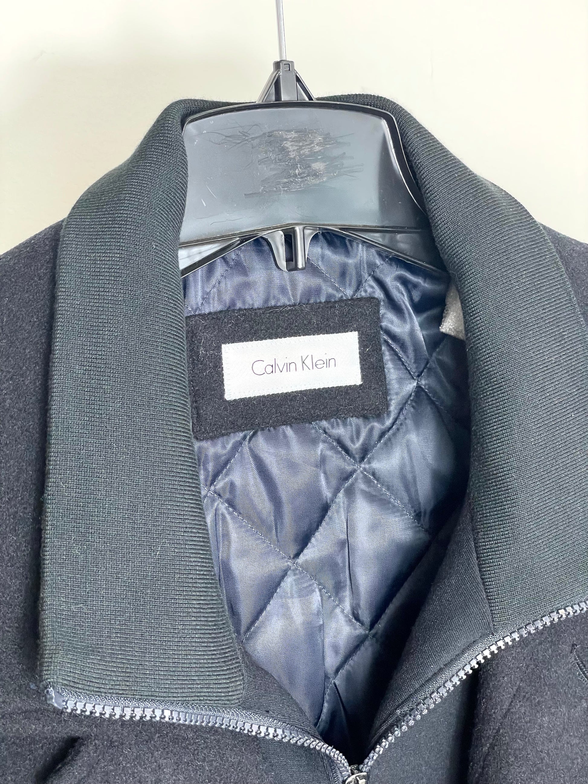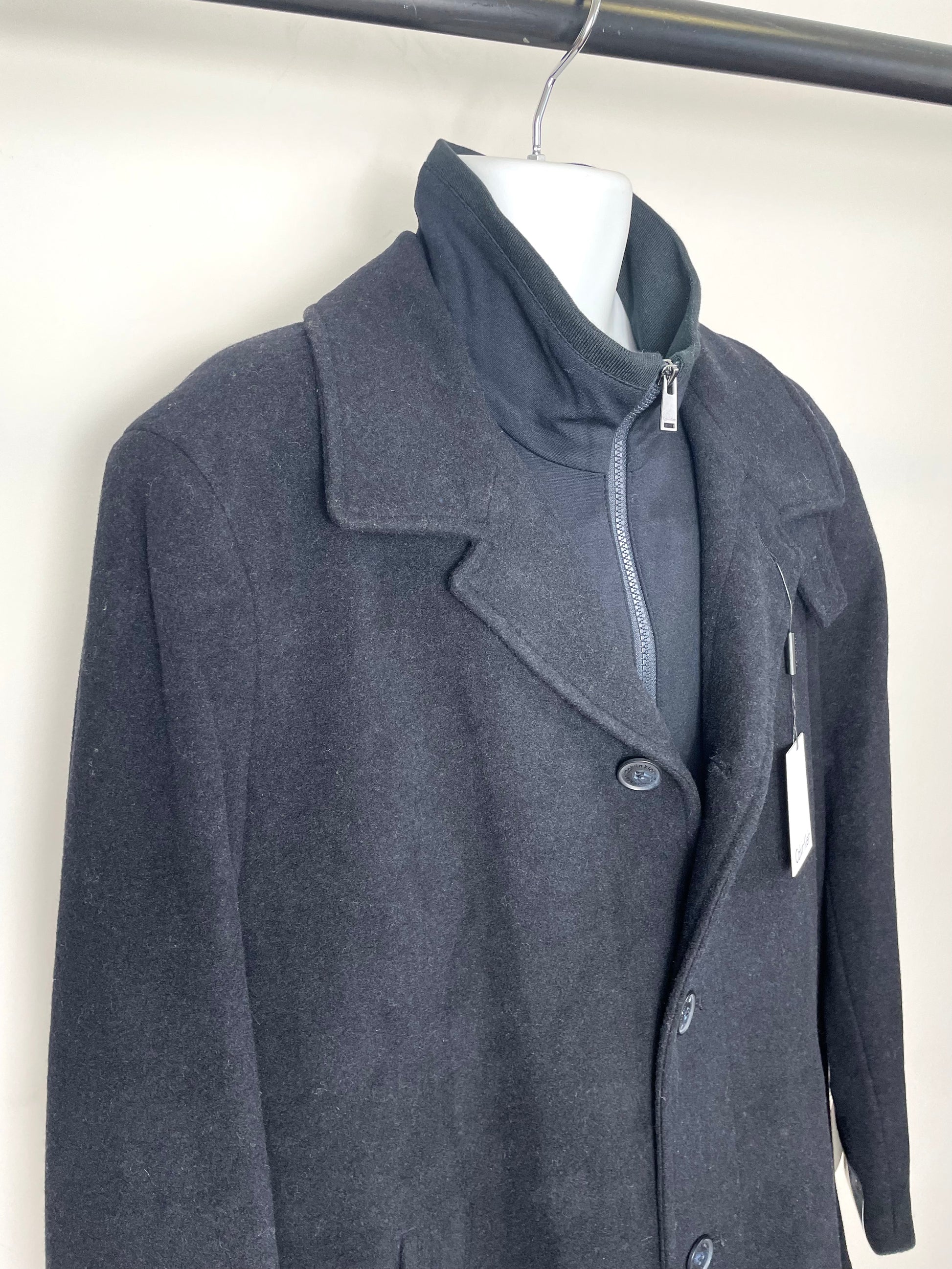 Calvin Klein's black wool blend overcoat featuring an inner a zip-front with funnel neck, buttoned outer layer with a classic notched collar.