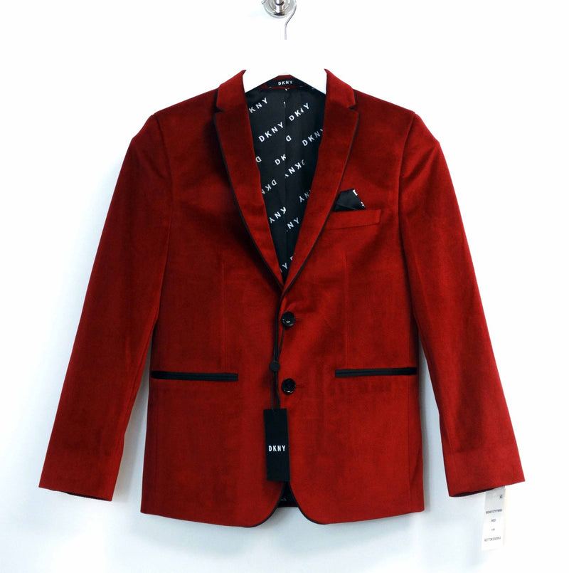 Bold red velvet styling and a contrasting collar create the high-fashion look of this dynamic suit jacket from DKNY.
