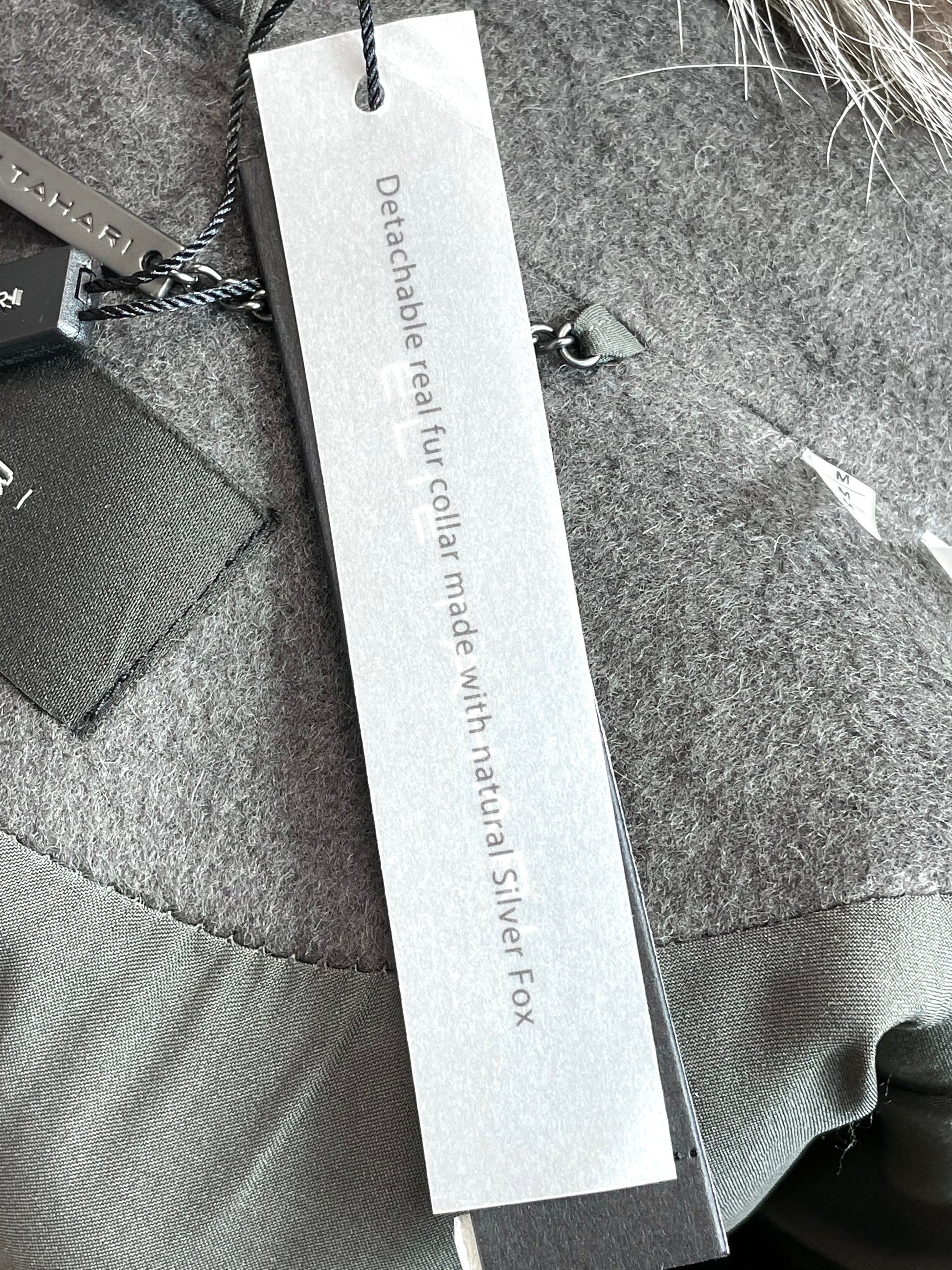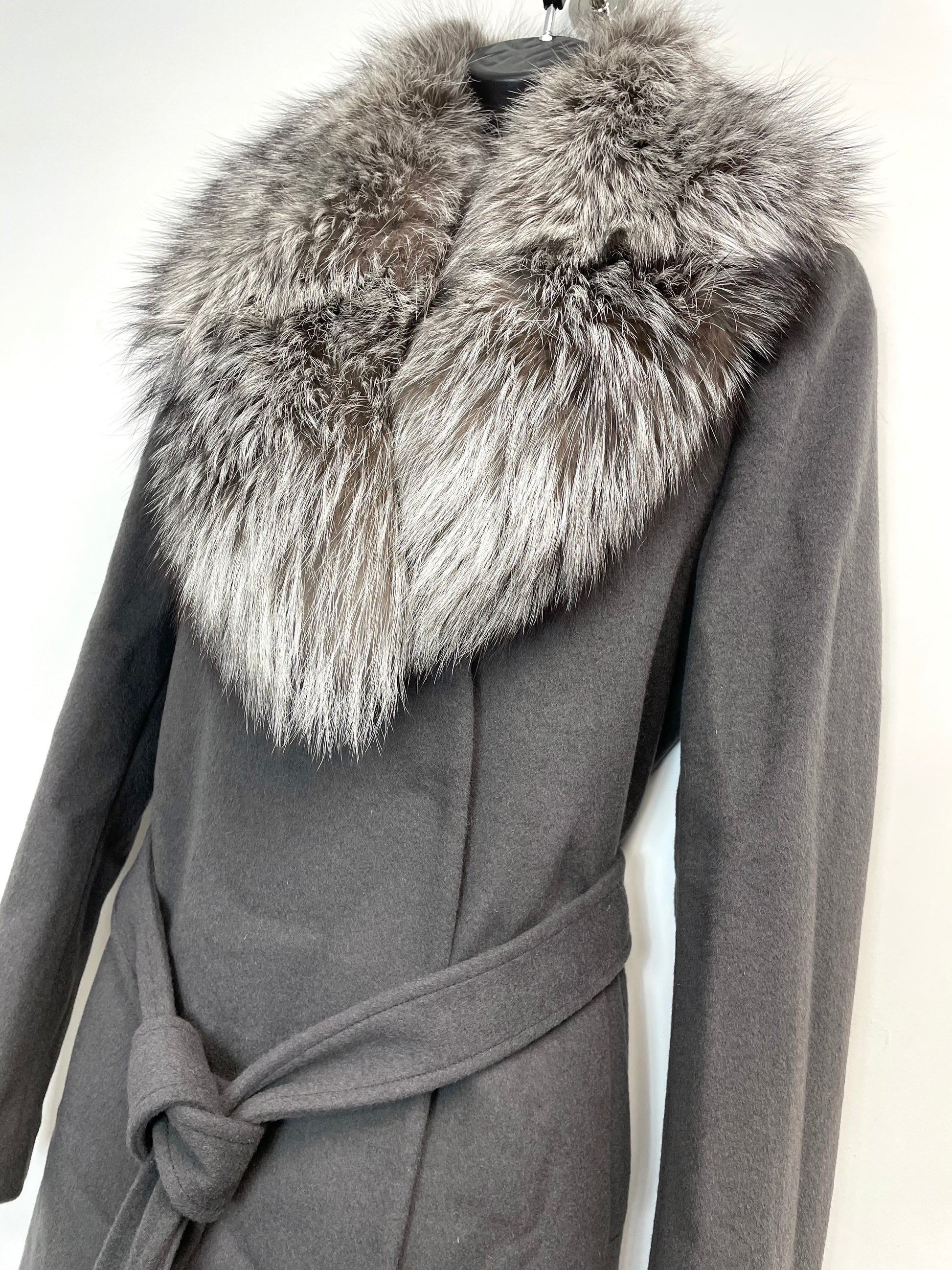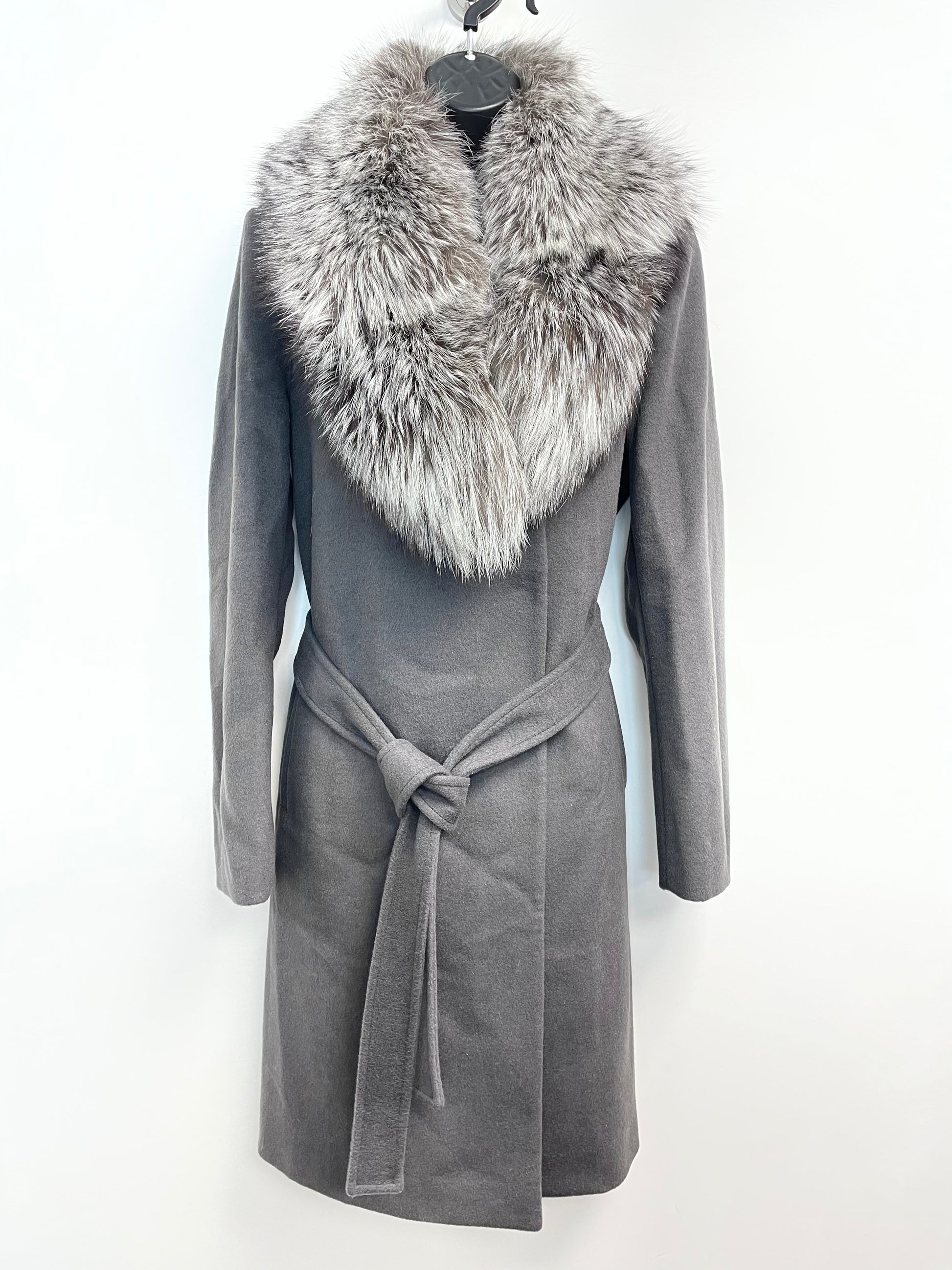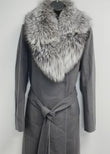 Elie Tahari Grey Women’s Wrap Coat with Genuine Fox Fur Trim M