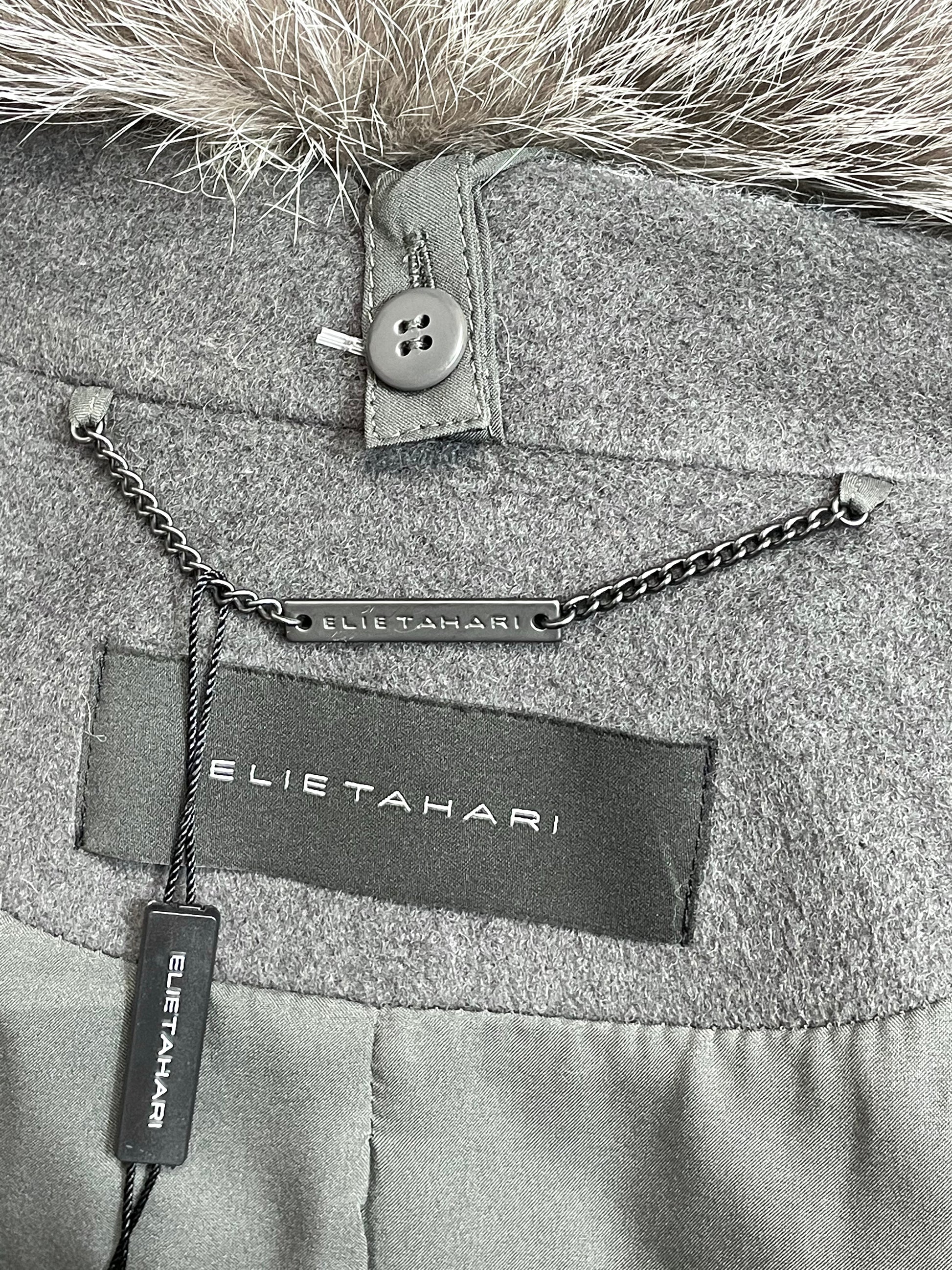 "Get ready to stand out from the crowd with this rare Elie Tahari wrap coat! With genuine fox fur trim and a sleek grey design, this coat will keep you warm and stylish all winter long. Don't miss out on this one-of-a-kind piece!"