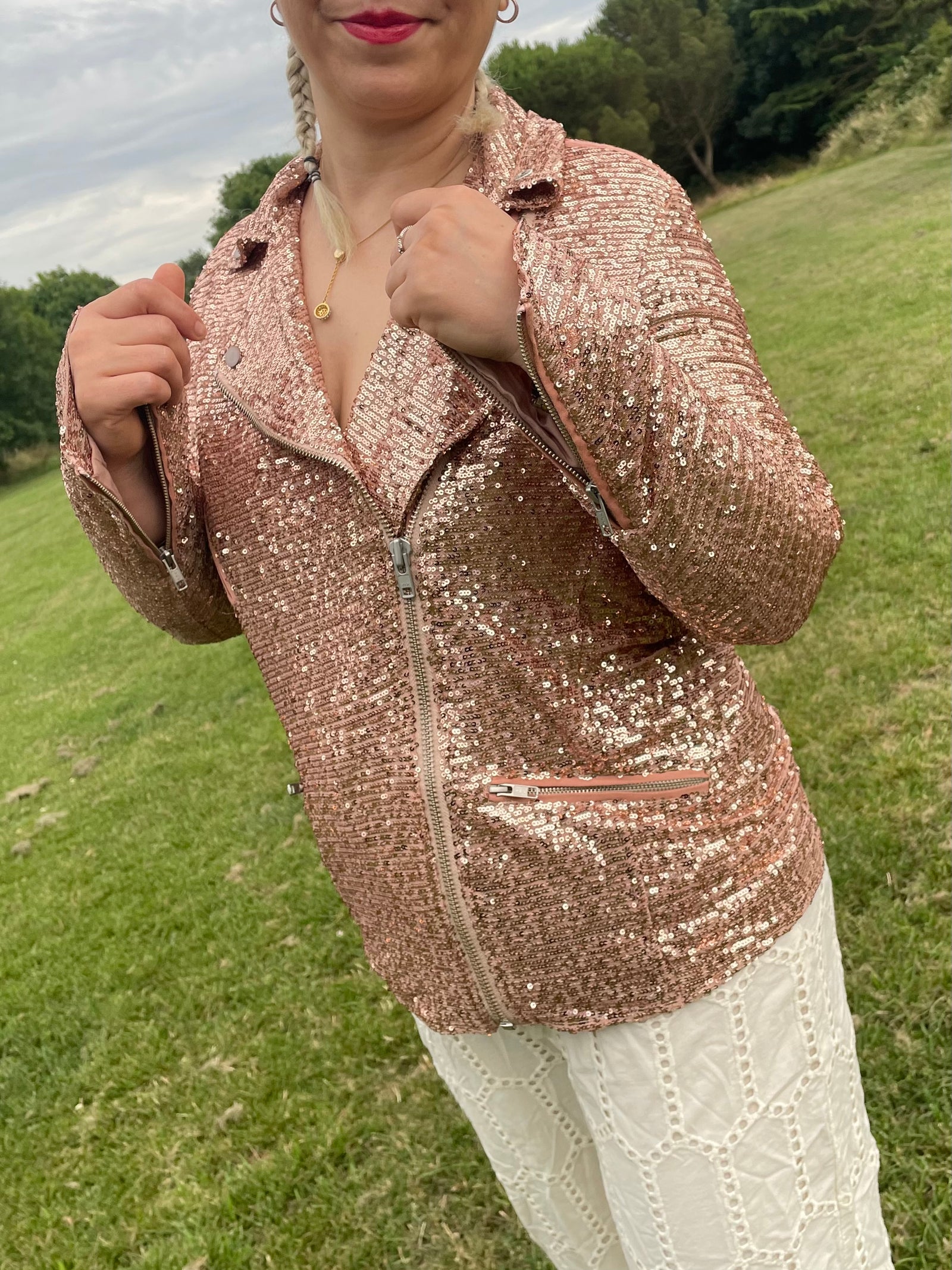 Free People Midnight Message Moto Sequin Jacket in Rose Gold