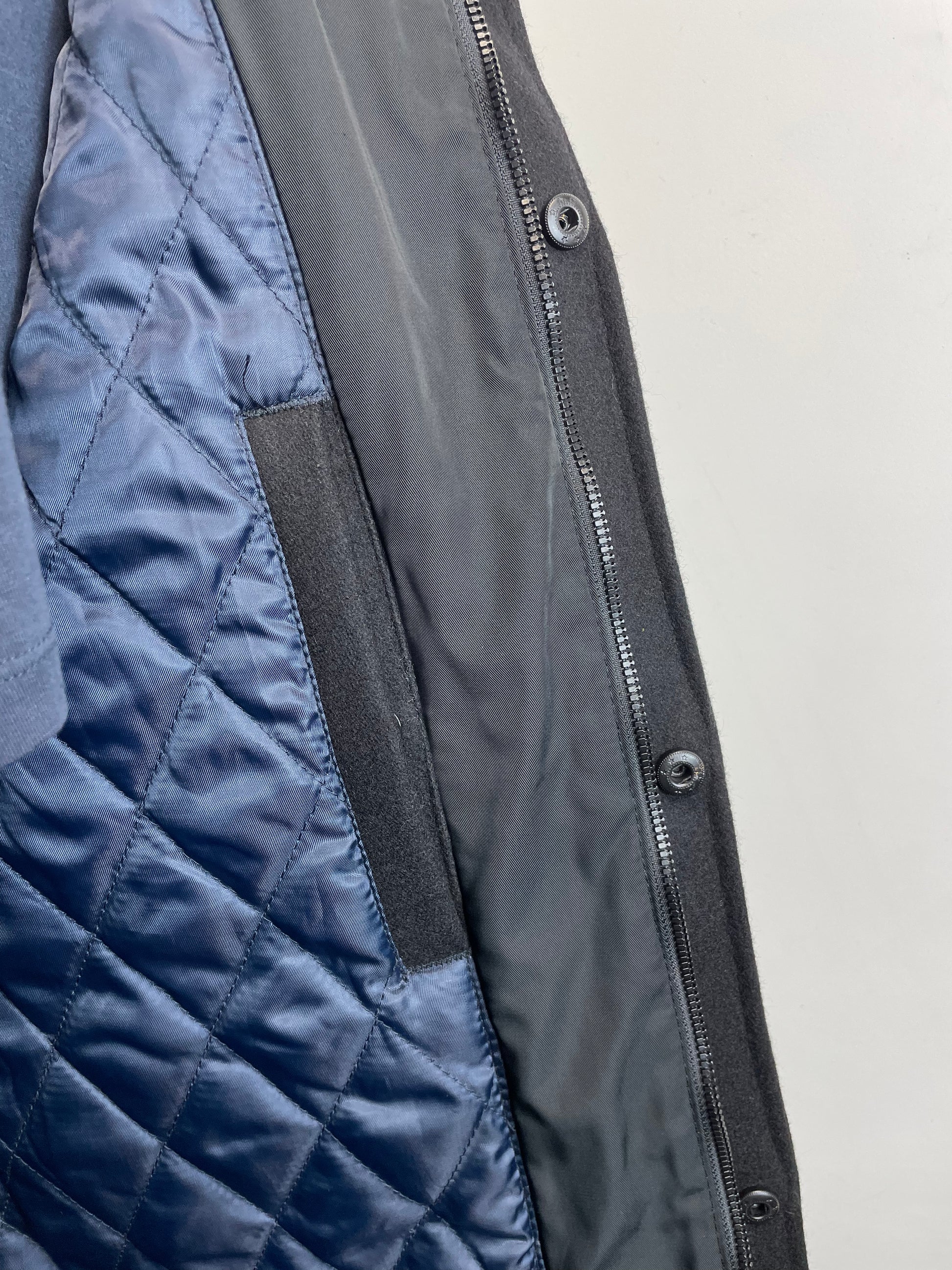 A military-inspired field coat with multiple pockets is crafted from a slightly textured wool-blend. Stand collar. Long sleeves. Front button with concealed zip and internal drawstring.