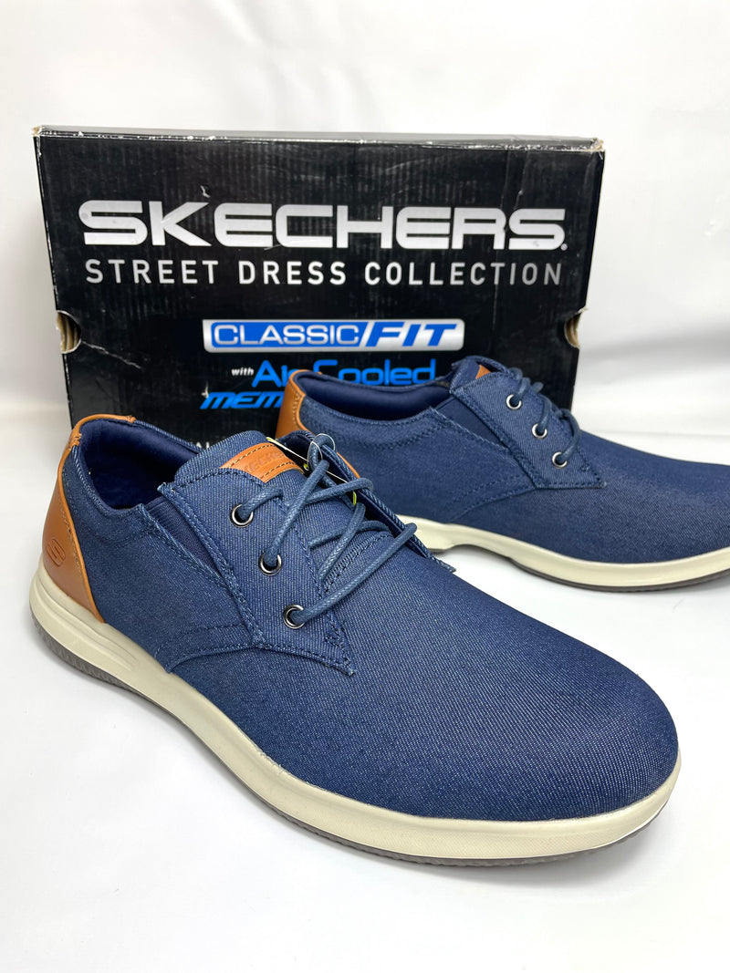 An ideal combination of refined style and laid-back comfort comes in the SKECHERS Darlow - Remego shoe. Soft woven canvas fabric and smooth synthetic upper in a lace up casual dress comfort plain toe oxford with stitching and overlay accents. Air Cooled Memory Foam insole.