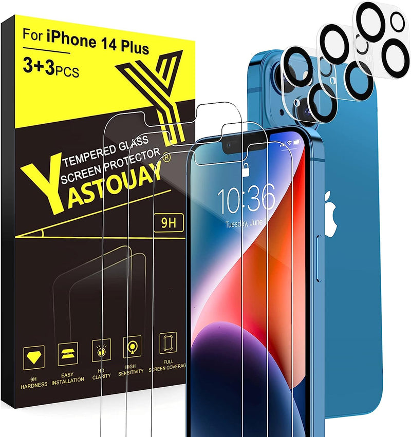 Yastouay 3+3 Pack Screen & Camera Protector for iPhone 14 Plus 6.7” - 3 Tempered Glass + 3 Lens Covers